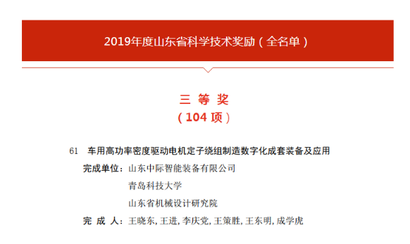近日,山东省人民政府【鲁政发〔2019〕16号】通知发布,省政府决定,对为我省科学技术进步、经济社会发展作出突出贡献的科学技术人员和组织给予奖励。由山东中际智能装备有限公司牵头完成的“车用高功率密度驱动电机定子绕组制造数字化成套装备及应用”项目获山东省科技进步奖三等奖。